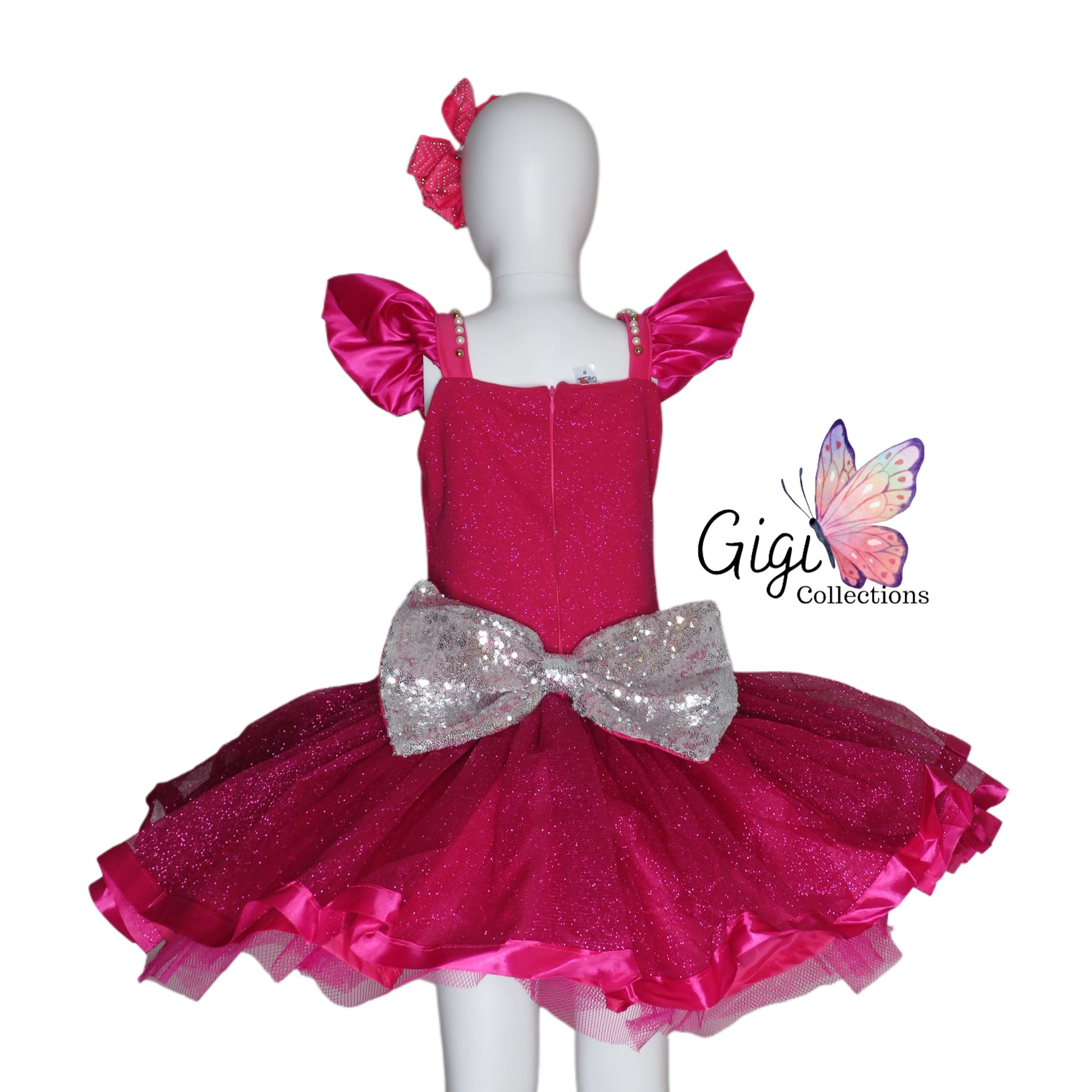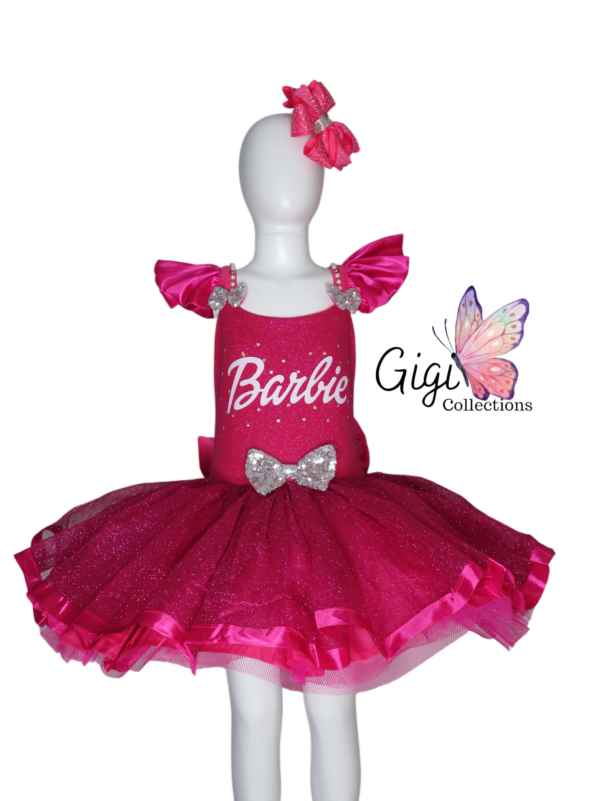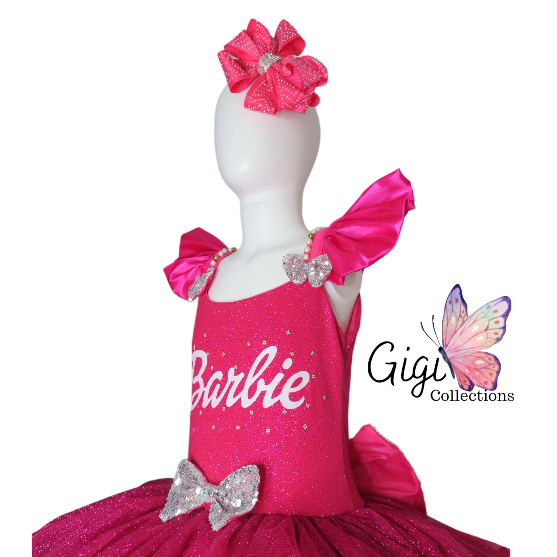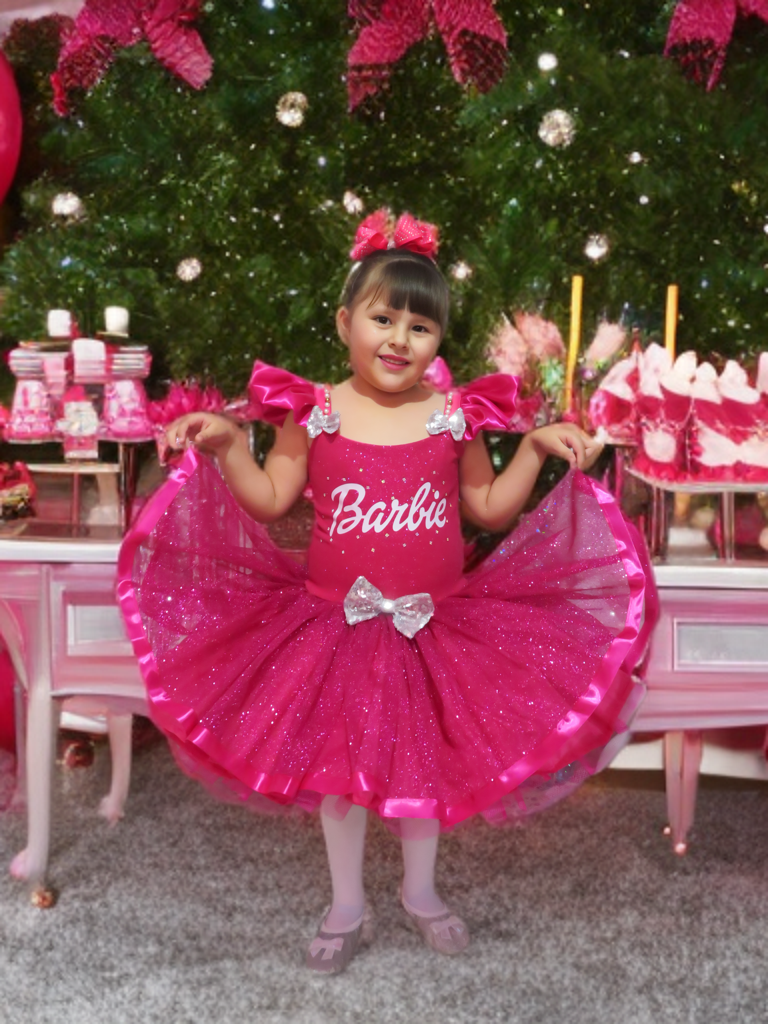 Make your little girl shine with this Barbie pink tutu dress. 🌸 Designed in a vibrant fuchsia shade with sparkling details, it features a soft bodice decorated with the word Barbie and a silver bow on the front. The fluffy tulle skirt with satin edging gives it an elegant and eye-catching effect. The back has a large decorative bow, and it also comes with a matching hair bow to complete the outfit. Perfect for birthdays, presentations, photoshoots, or themed parties.