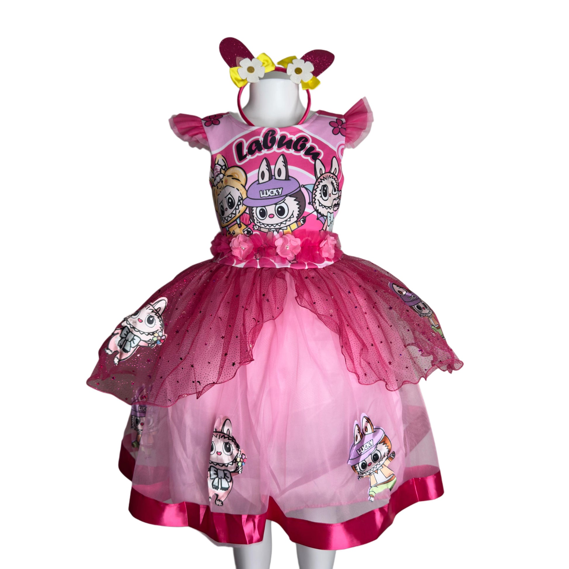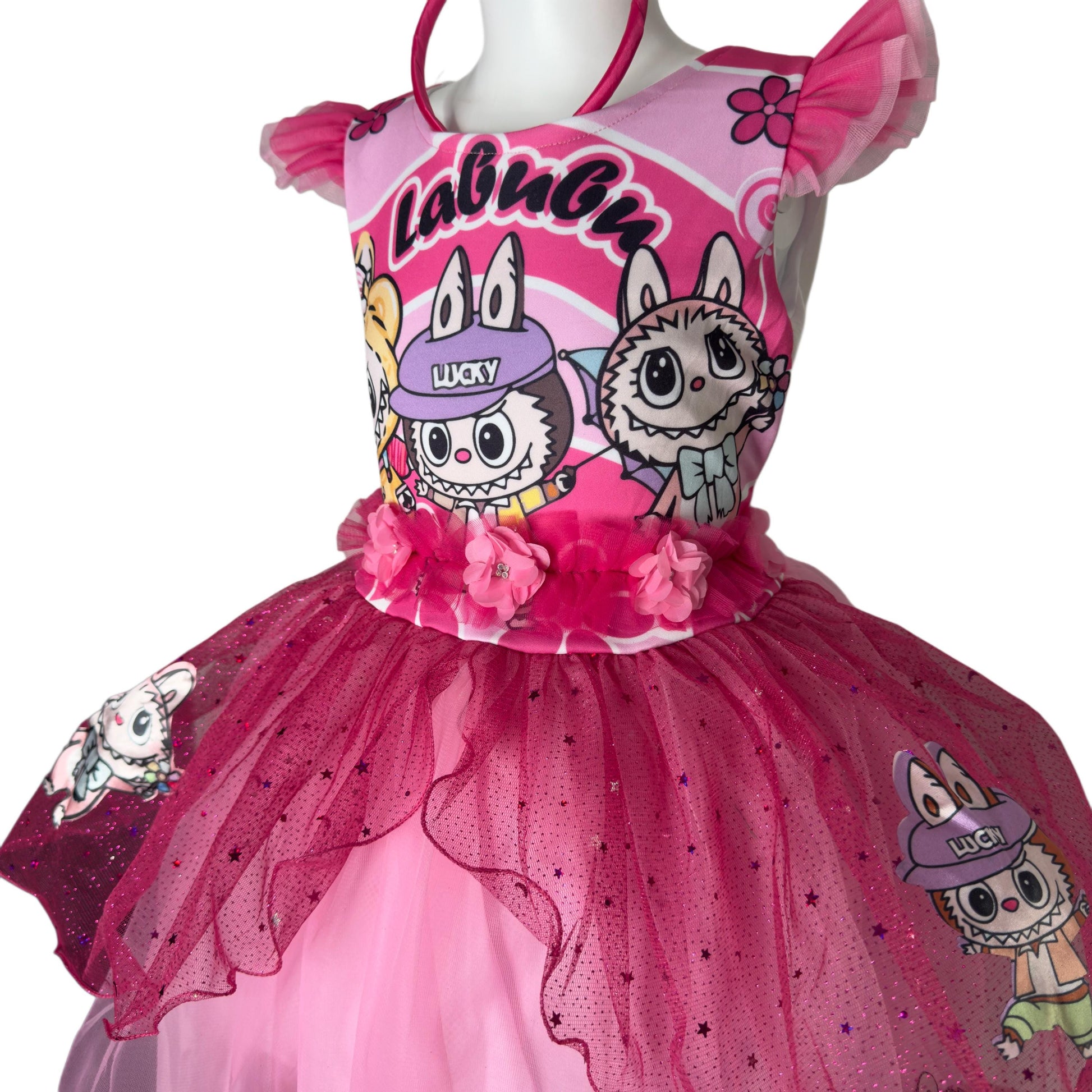 Make your little one stand out with this adorable “Labubu” Princess Dress! 💖 Perfect for birthdays, themed parties, photo sessions, or special events. Featuring a vibrant cartoon print, soft layered tulle skirt with glitter, and matching floral waist detail, this handmade dress is both magical and comfortable.