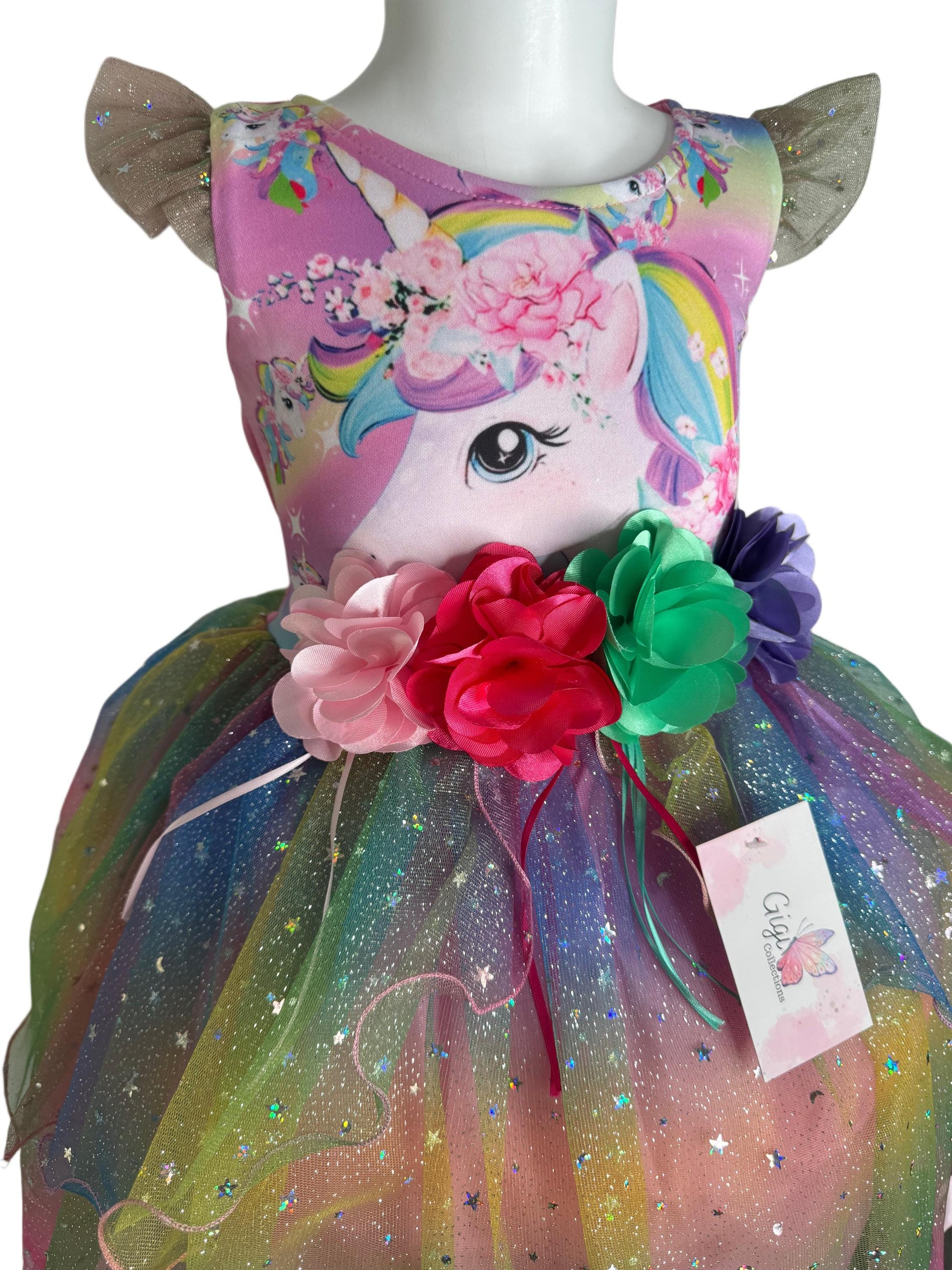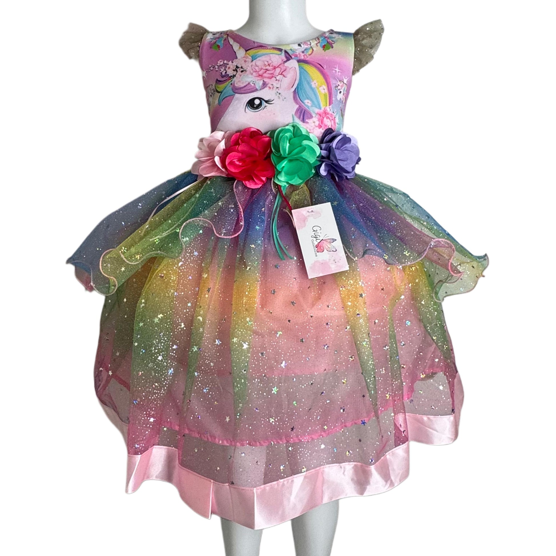Bring a touch of magic to your little one’s special day with this Unicorn Rainbow Tutu Dress. Designed with sparkling layers of rainbow tulle, a soft satin lining, and a beautiful unicorn print bodice, this dress is perfect for birthdays, parties, photoshoots, and dress-up fun.