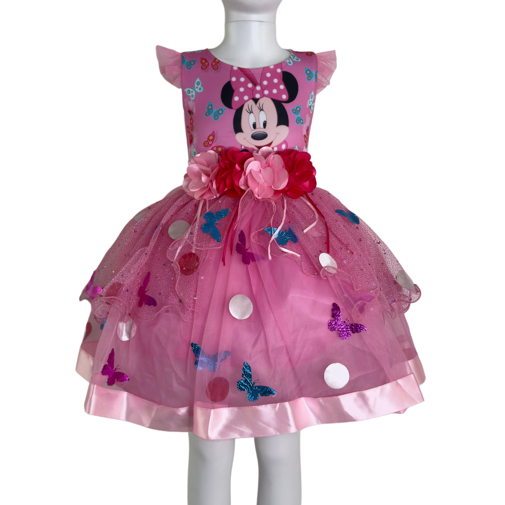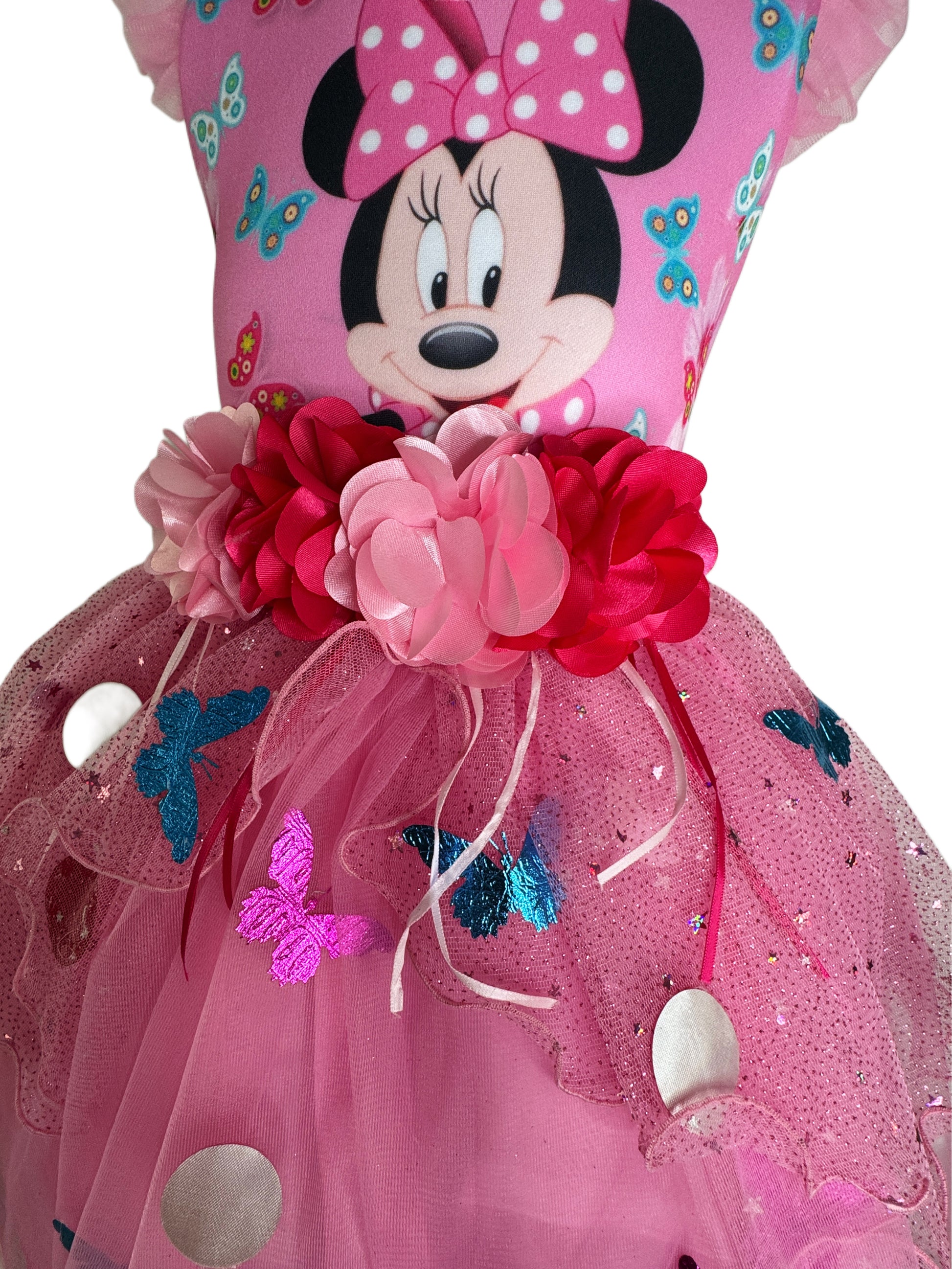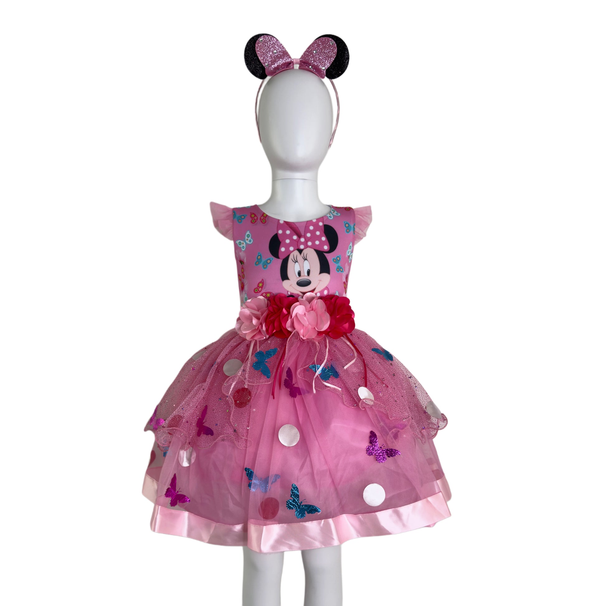 Make your little one shine with this pink Minnie tutu dress 🎀. The bodice features Minnie with her iconic pink polka dot bow, decorated with butterflies for a magical touch. The fluffy tulle skirt is adorned with waistline flowers, shiny polka dots, and colorful butterflies that stand out beautifully. Comes with a matching headband with Minnie ears and a sparkling pink bow, completing the outfit. Perfect for birthdays, presentations, themed parties, or photoshoots.