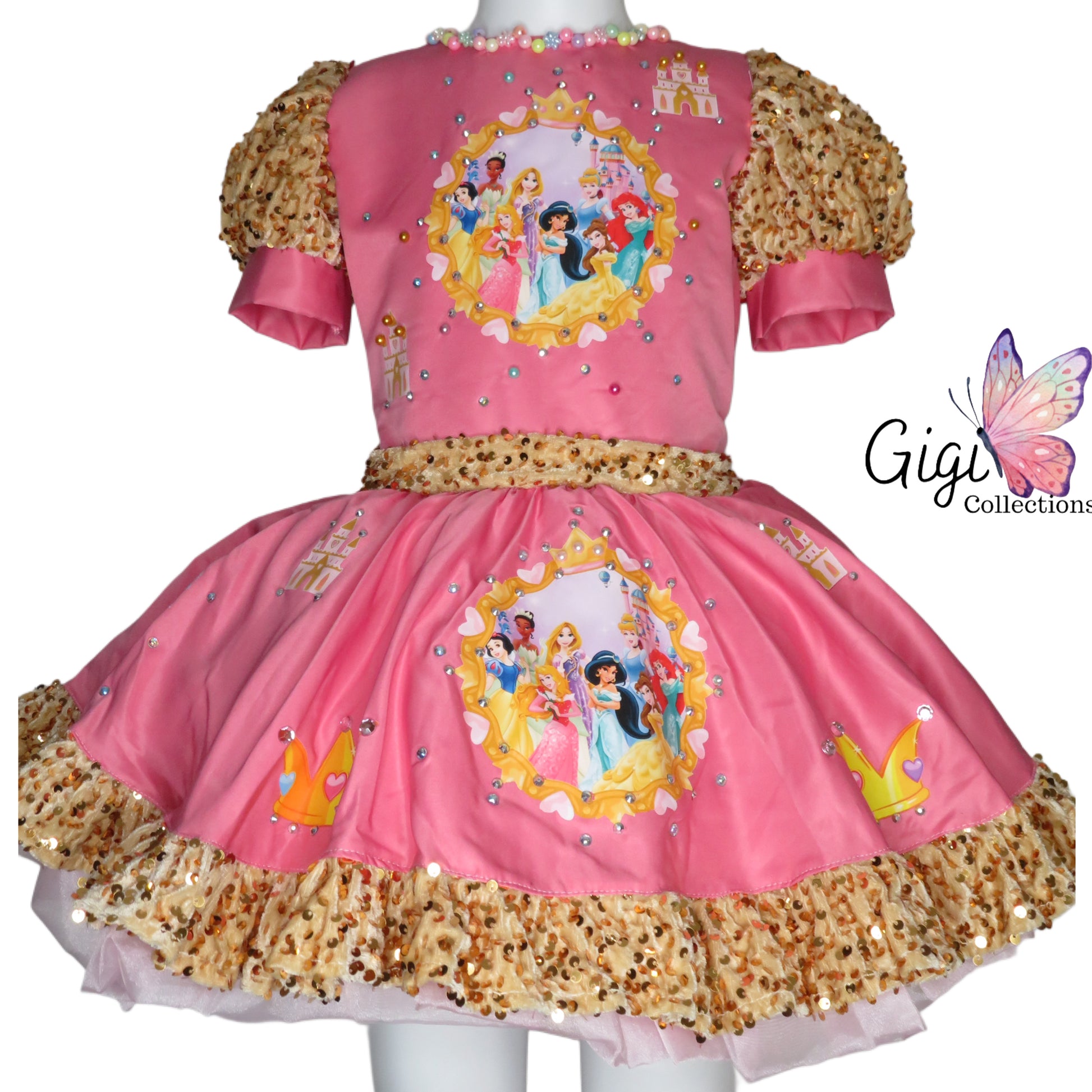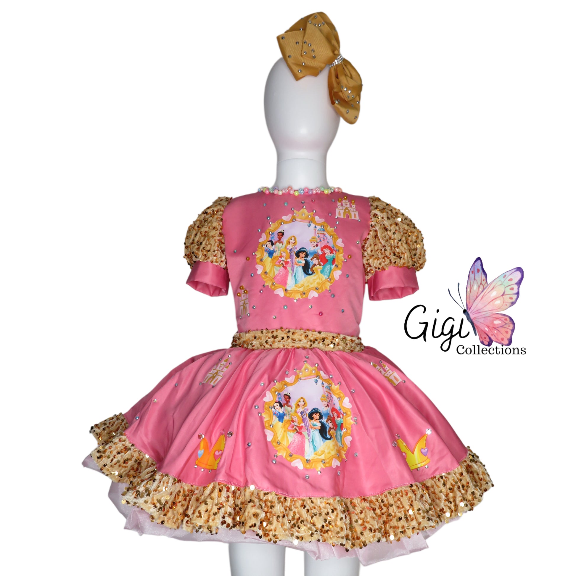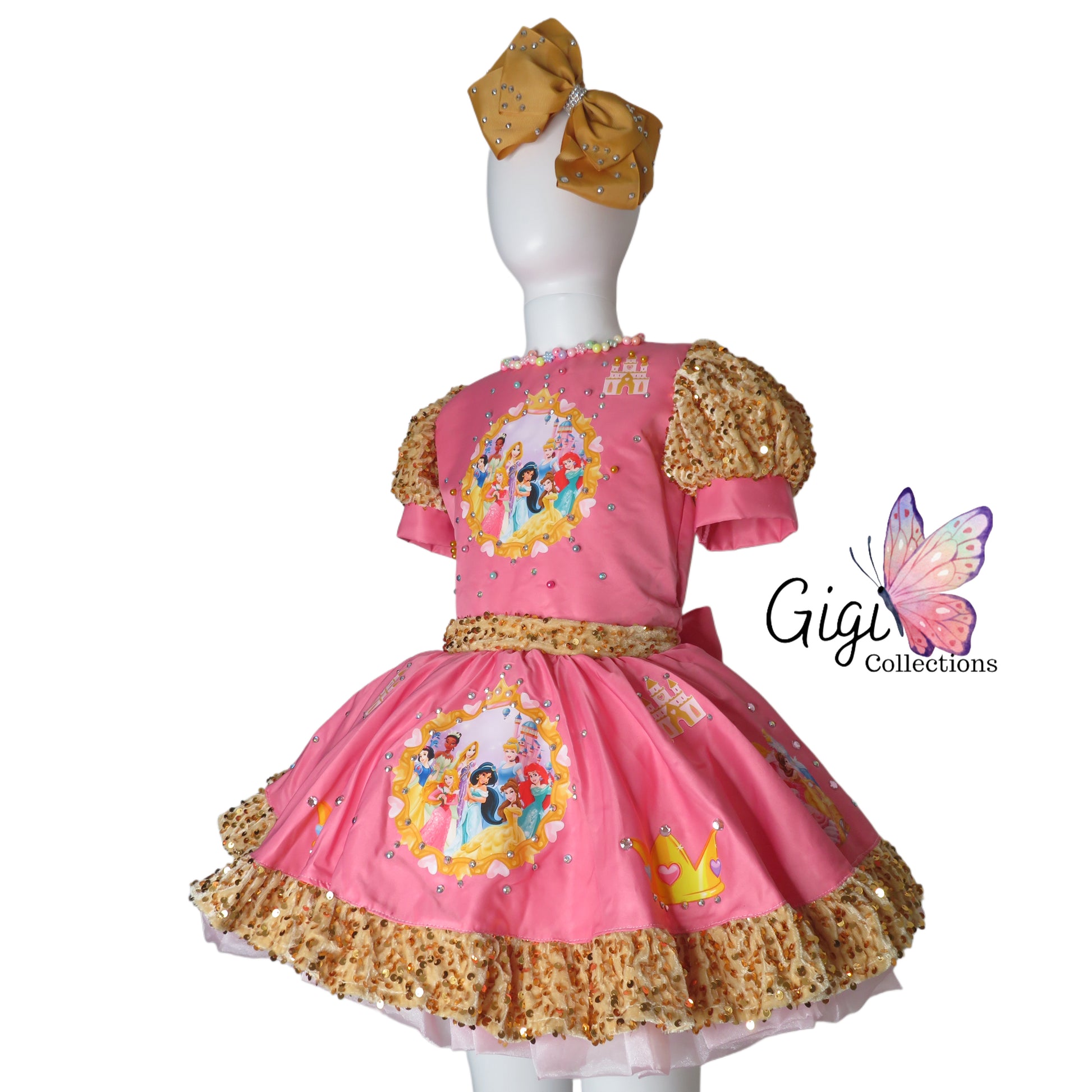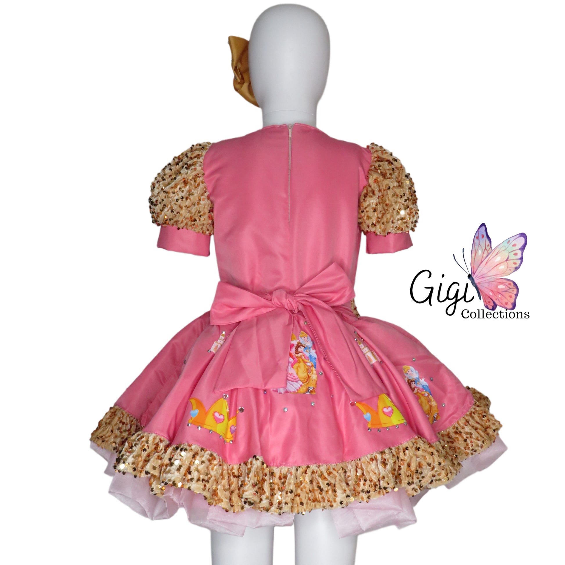 Your little princess will shine in this handmade pink tutu dress inspired by her favorite fairy tale characters. Designed with sparkling rhinestones, golden sequin puff sleeves, and a fluffy skirt full of detail, this dress is perfect for birthdays, photo shoots, and special celebrations. Includes a matching oversized bow for the complete royal look.