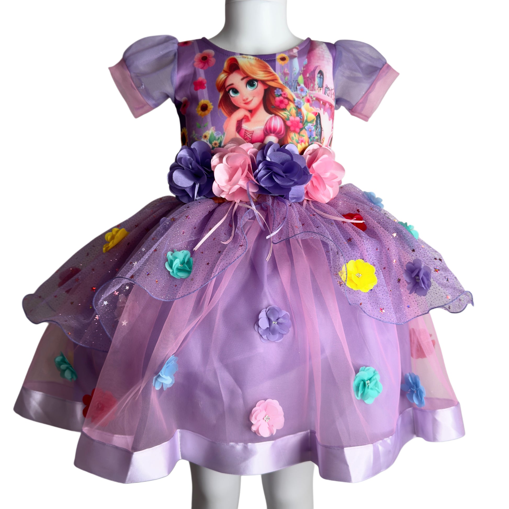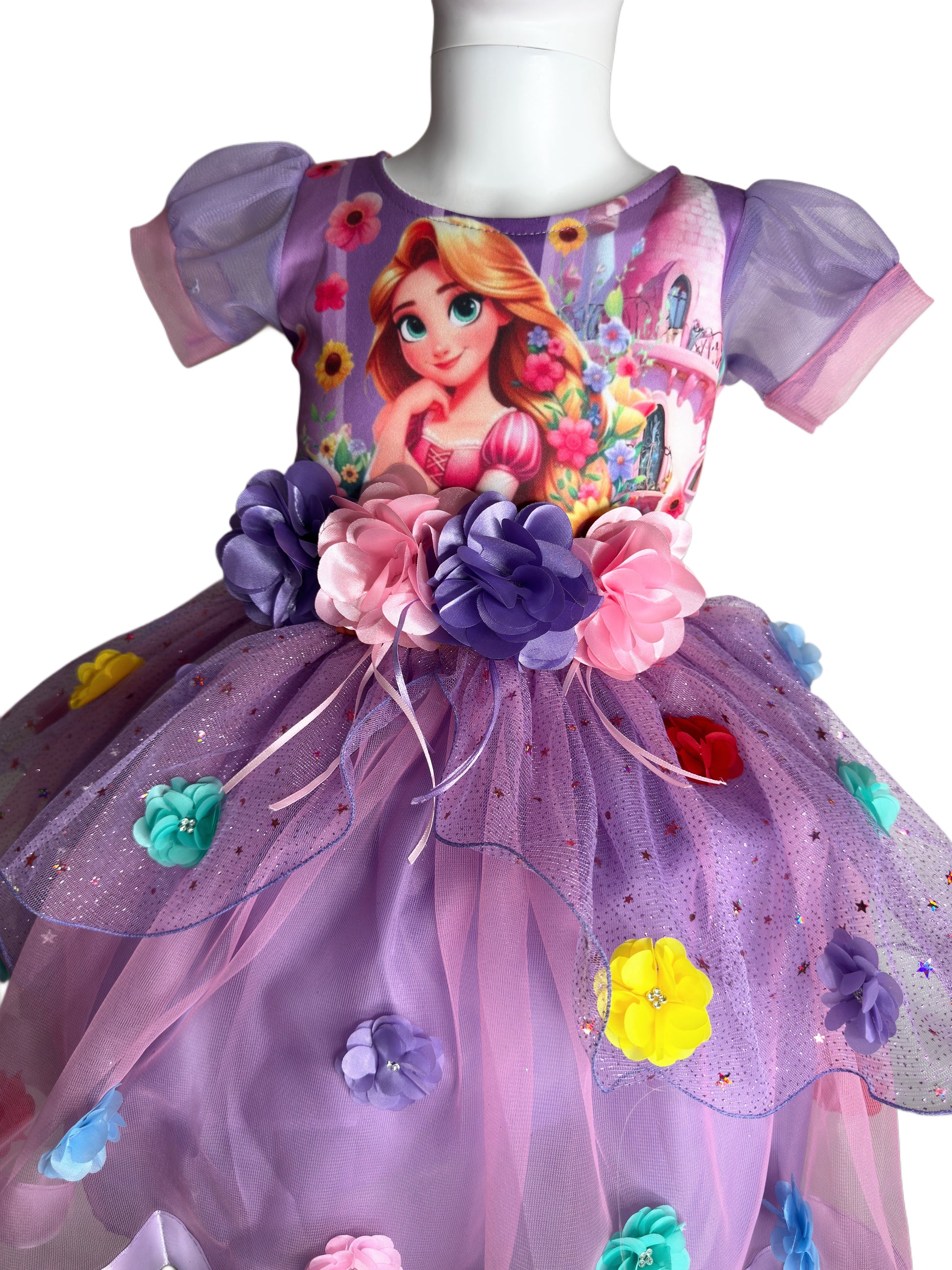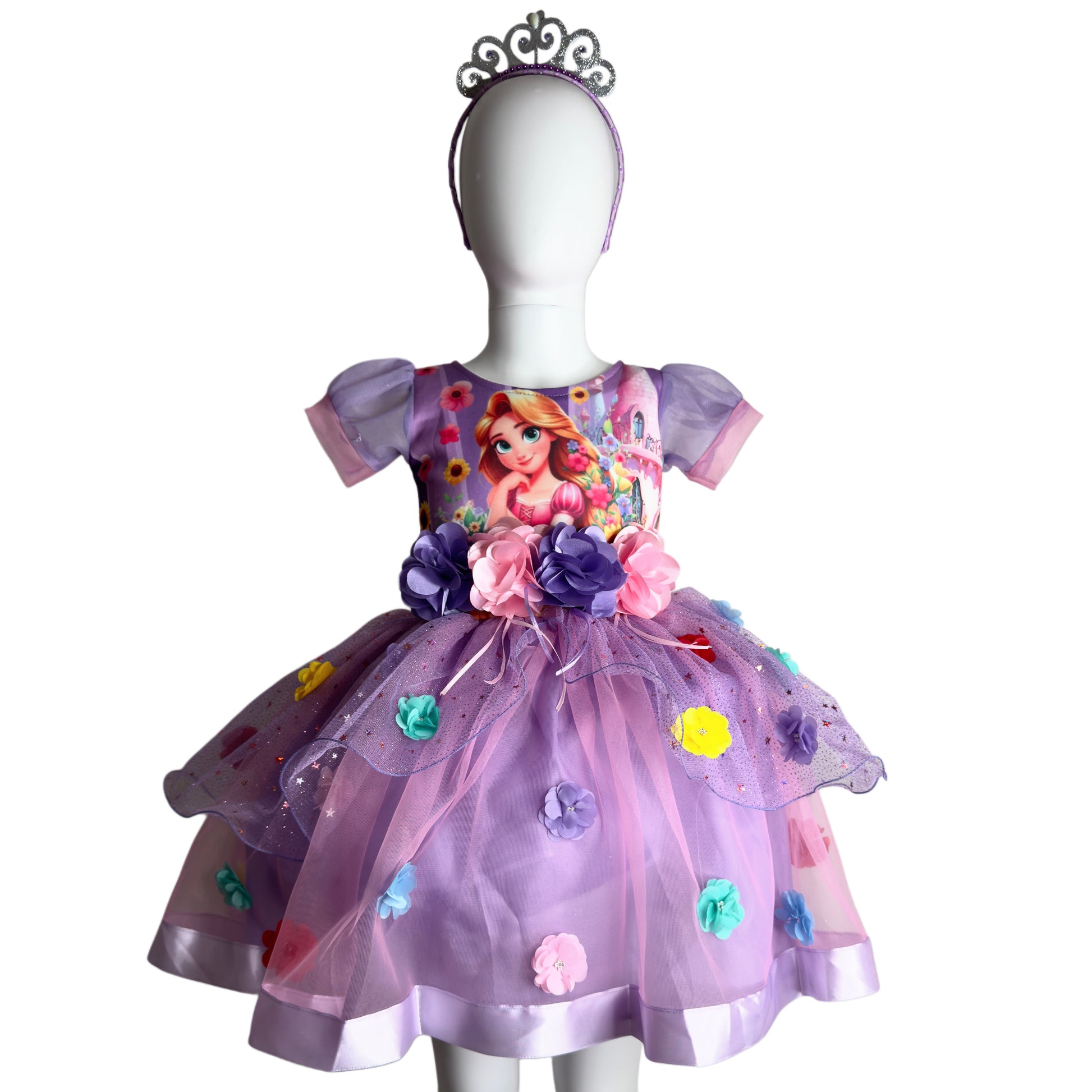 Make your little girl shine with this Rapunzel tutu dress in lilac. 💜 Featuring a printed bodice of the princess and soft tulle sleeves, it is decorated with pastel flowers for a magical touch. The fluffy tulle skirt is embellished with colorful flowers that sparkle with every move. Comes with a sparkling princess tiara to complete the look. Perfect for birthdays, school presentations, themed parties, or photoshoots.